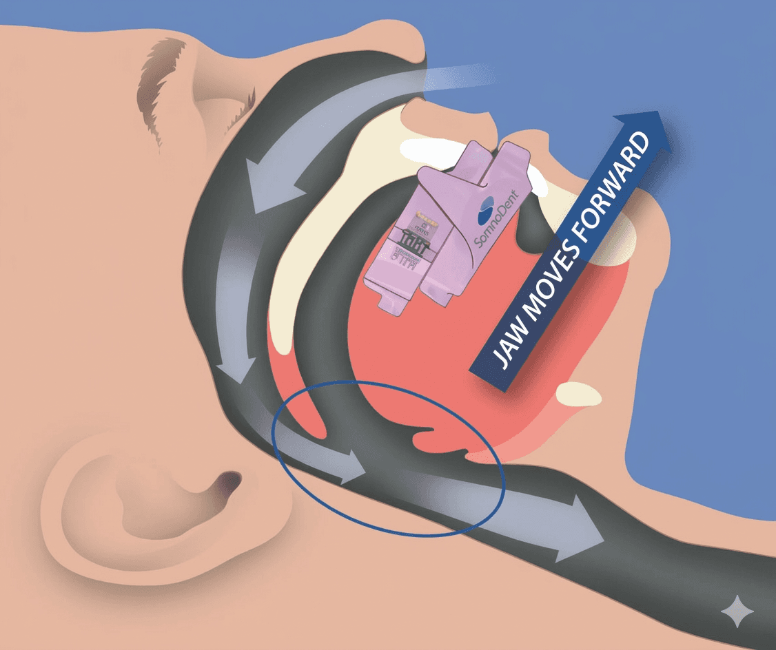 Snoring and sleep apnoea can be caused by the airway at the back of your throat narrowing while you sleep. Somnodent moves your jaw and tongue forward while you sleep to open up your airway to treat your sleep apnoea.